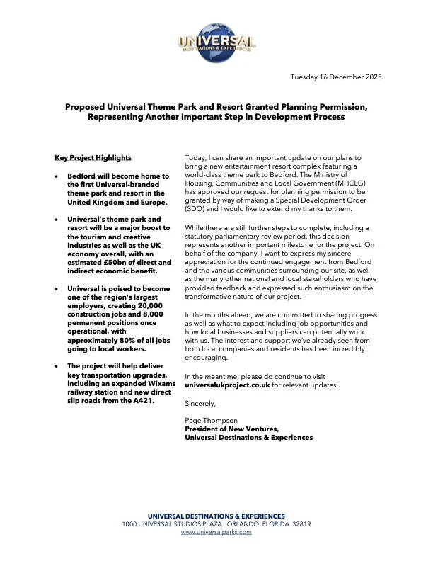 The proposed Universal theme park and resort planned for Bedford has taken a significant step forward, with planning permission now officially approved by the UK government.